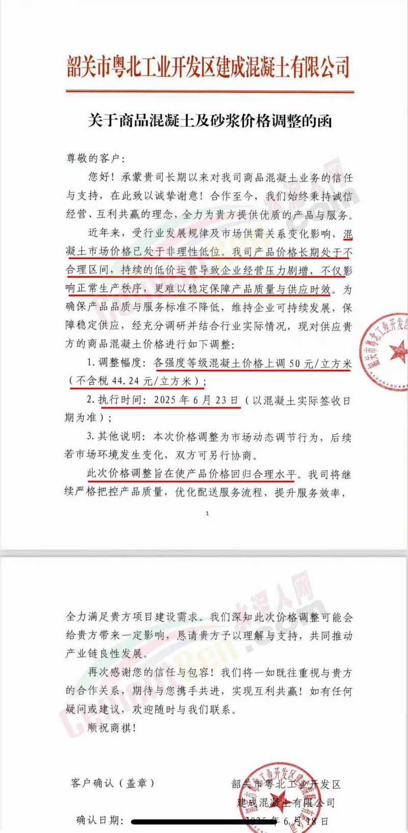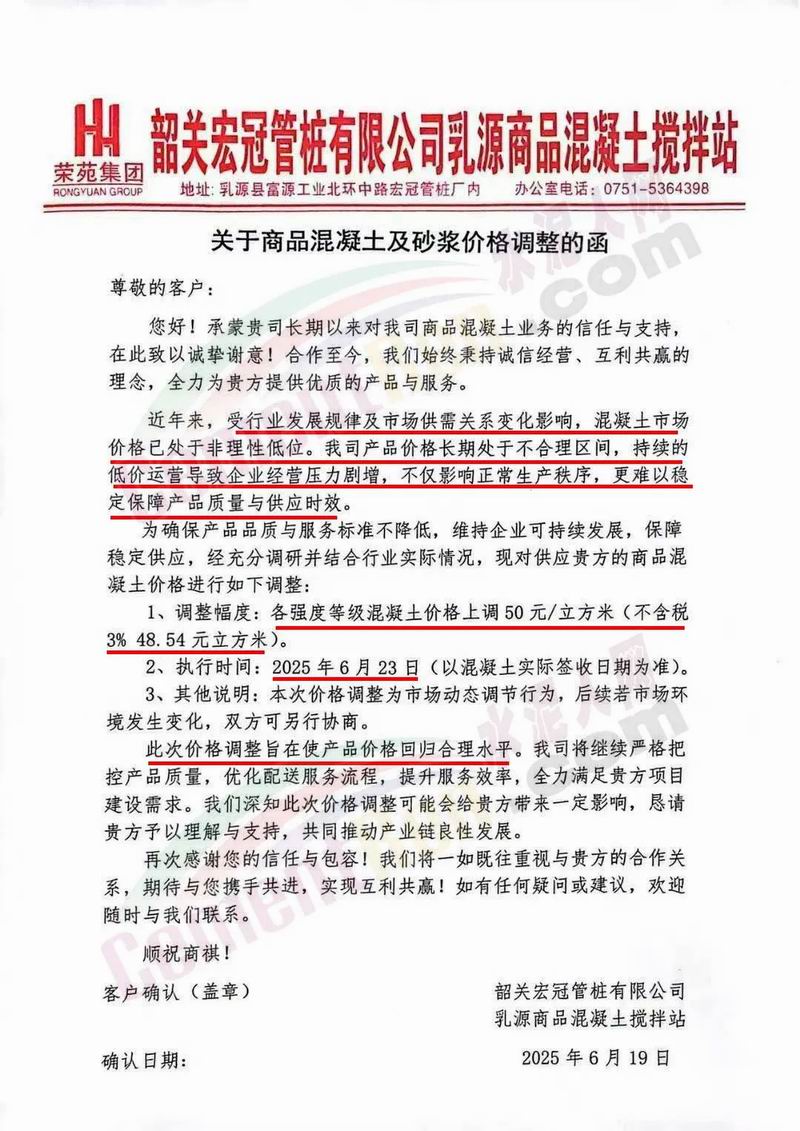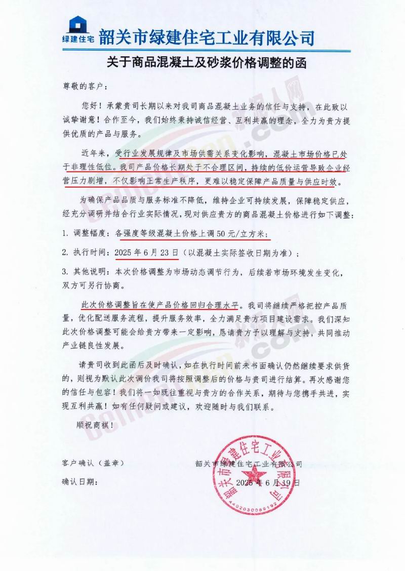 近日,乳源瑤族自治縣宏建商品混凝土有限公司、韶關(guān)市城興住宅工業(yè)有限公司、韶關(guān)市三創(chuàng)混凝土有限公司等近10家商品混凝土企業(yè)聯(lián)合發(fā)布調(diào)價函,宣布自2025年6月23日起,各強度等級混凝土價格統(tǒng)一上調(diào)50元/立方米。這一舉措不僅引發(fā)了行業(yè)震動,更被視為混凝土企業(yè)在長期低價競爭后的一次“絕地反擊”。