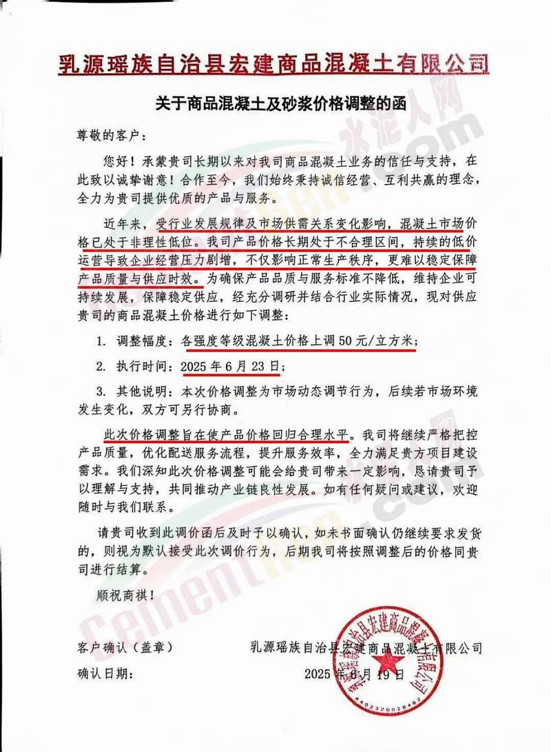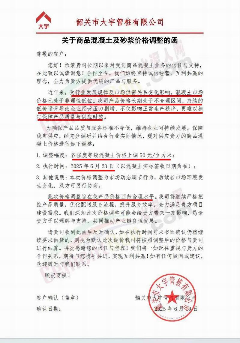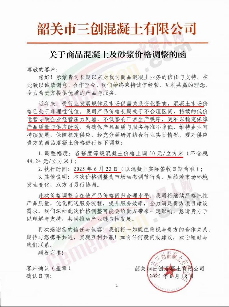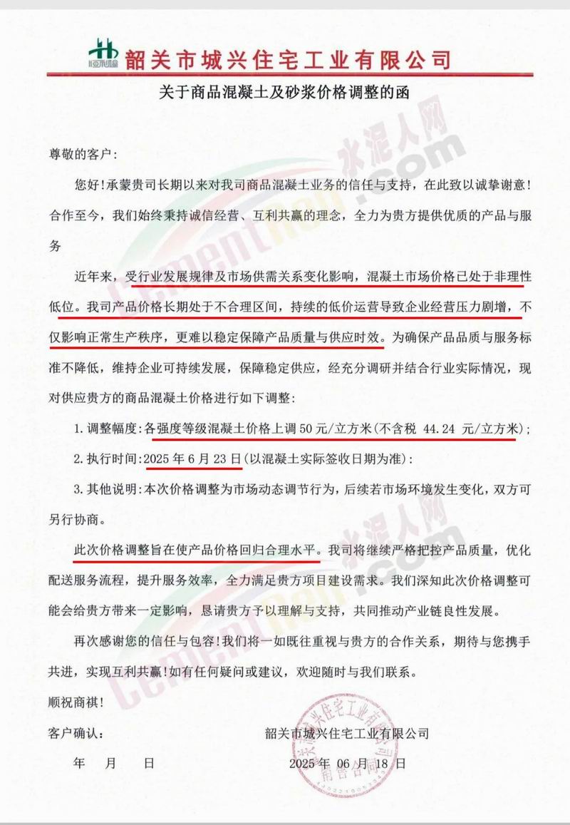 近日,乳源瑤族自治縣宏建商品混凝土有限公司、韶關(guān)市城興住宅工業(yè)有限公司、韶關(guān)市三創(chuàng)混凝土有限公司等近10家商品混凝土企業(yè)聯(lián)合發(fā)布調(diào)價函,宣布自2025年6月23日起,各強度等級混凝土價格統(tǒng)一上調(diào)50元/立方米。這一舉措不僅引發(fā)了行業(yè)震動,更被視為混凝土企業(yè)在長期低價競爭后的一次“絕地反擊”。