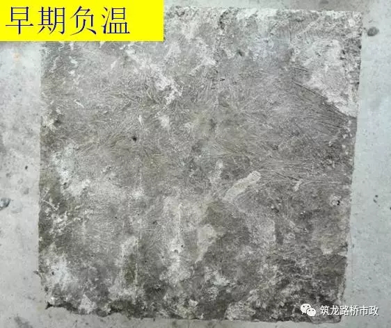 混凝土澆筑后隨即遭受較長(zhǎng)時(shí)間的負(fù)溫,尤其是-5~-10℃,大量的自由水向結(jié)構(gòu)物表面、骨料表層匯集,形成透鏡狀冰晶,在隨后的齡期中,氣溫緩慢回升,冰晶融化且水分揮發(fā),留下內(nèi)部缺陷,強(qiáng)度幾乎不可恢復(fù),抗?jié)B性、抗凍性幾乎損失殆盡。